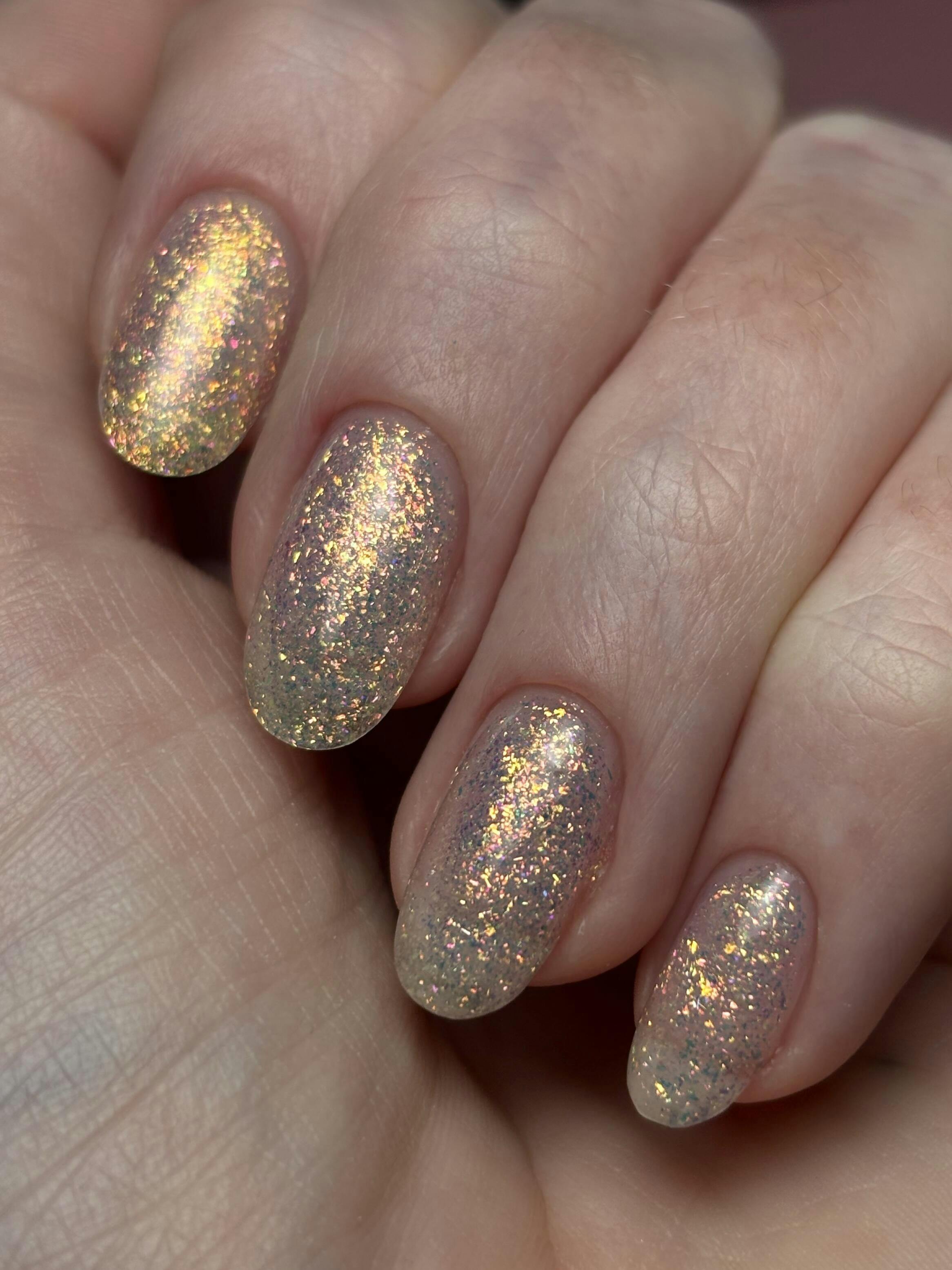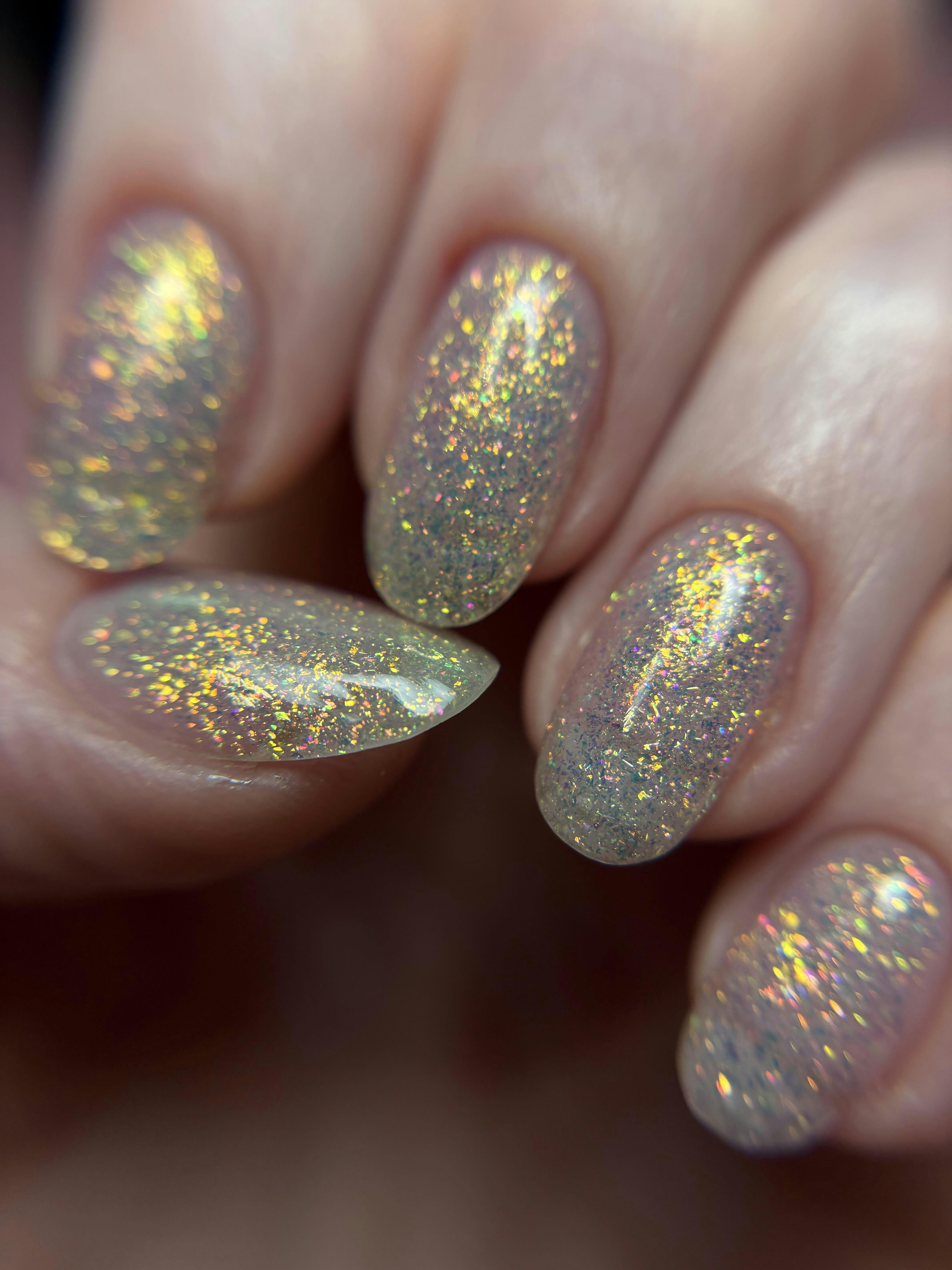 Iridescent semi-translucent base sparkles with multidimensional shimmer, shifting under every angle for a radiant, ethereal finish.✨